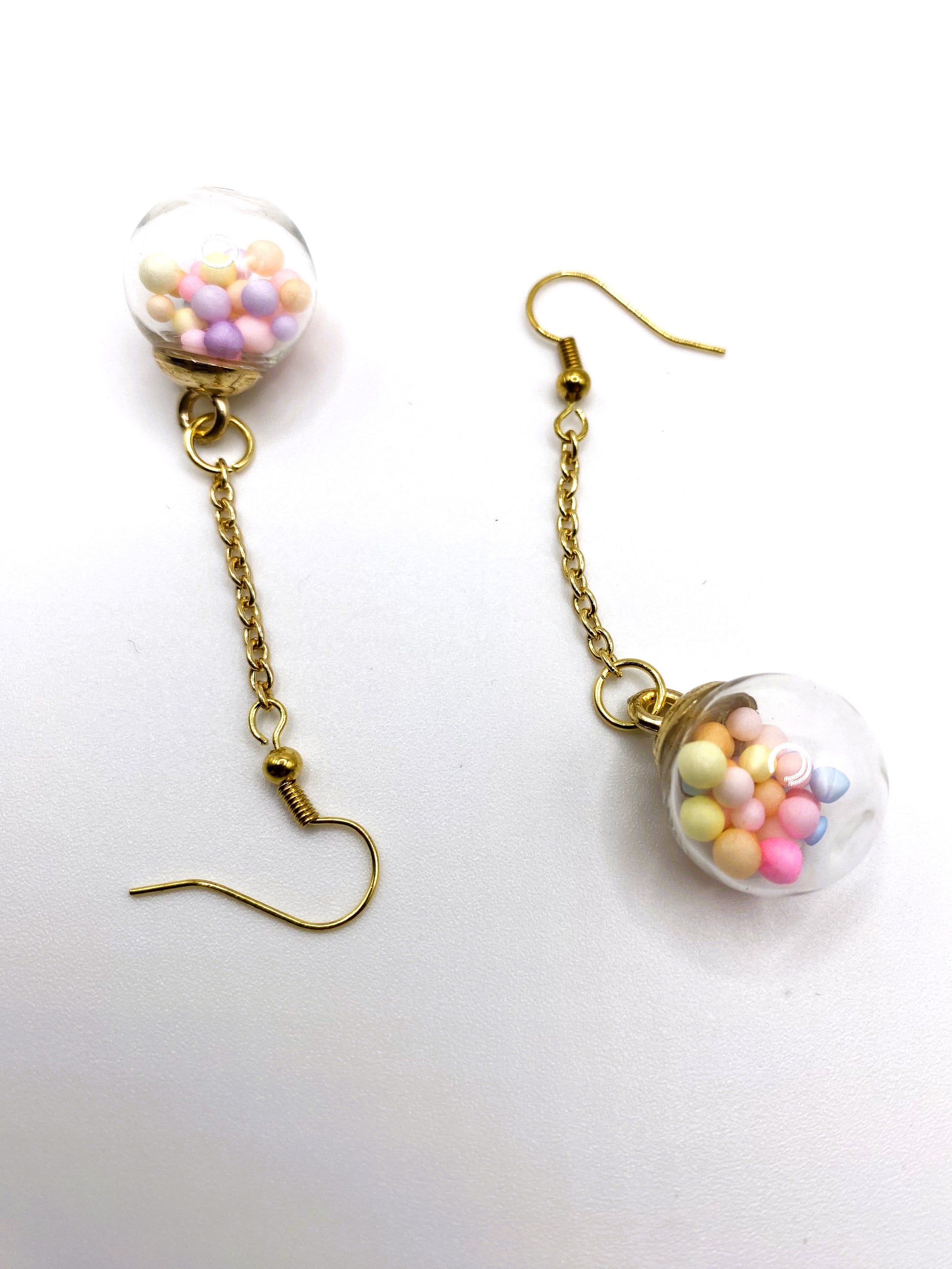 These 2.5-inch Sugar Gumball Earrings feature delicate gold chains adorned with a playful charm of a gumball machine filled with pastel-colored beads. Available in a variety of soft pastel shades, they bring a whimsical touch to any outfit and a fun, youthful aesthetic.