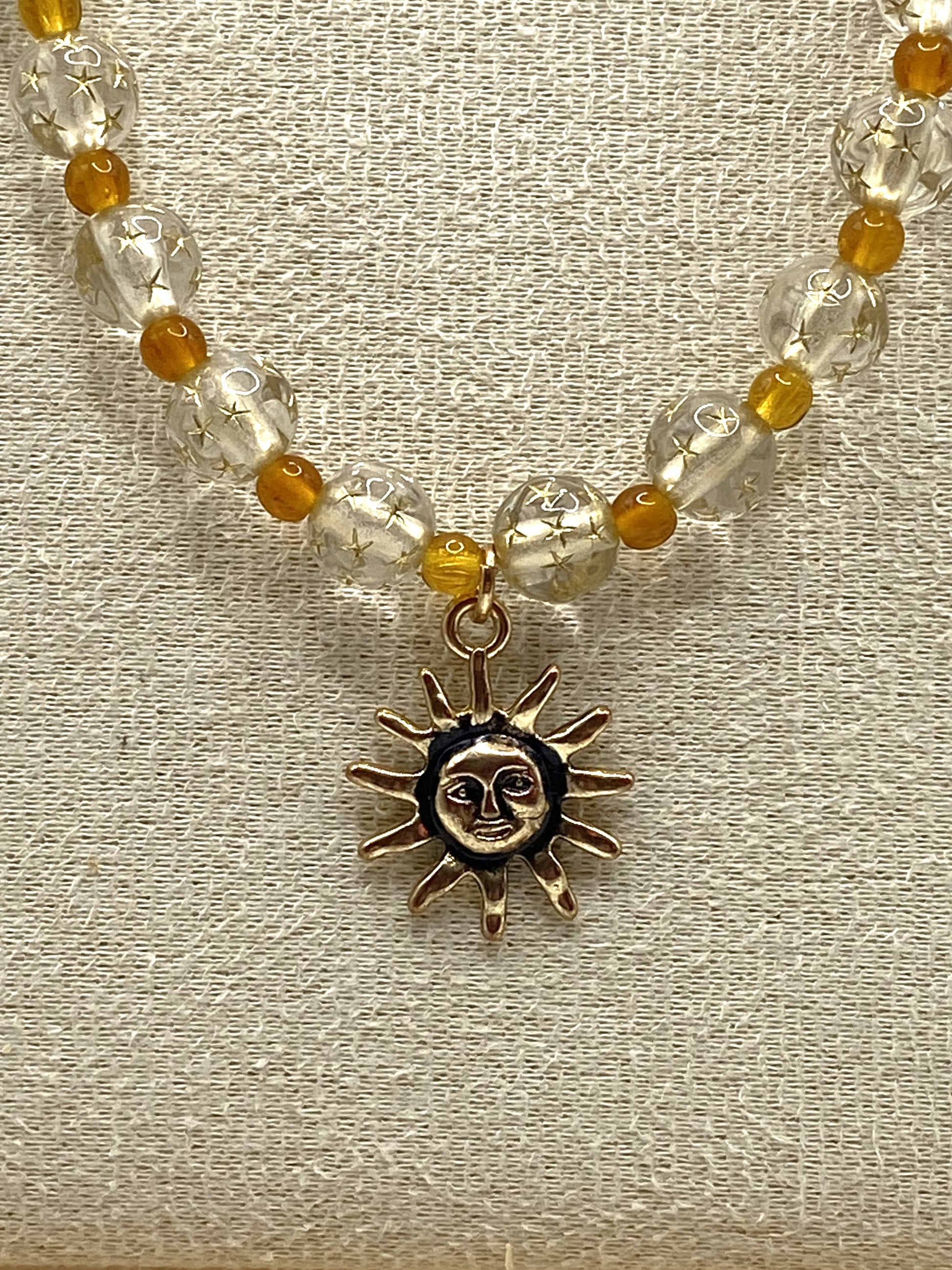 This 20-inch princess-style necklace features a vintage sun charm paired with clear starry beads, separated by amber spacer beads. Designed to evoke the imagination and wonder of the universe, its thoughtful combination of elements creates a delicate, celestial-inspired accessory. Ideal for adding a subtle yet meaningful touch to your ensemble, this necklace balances timeless charm with a sense of cosmic elegance.